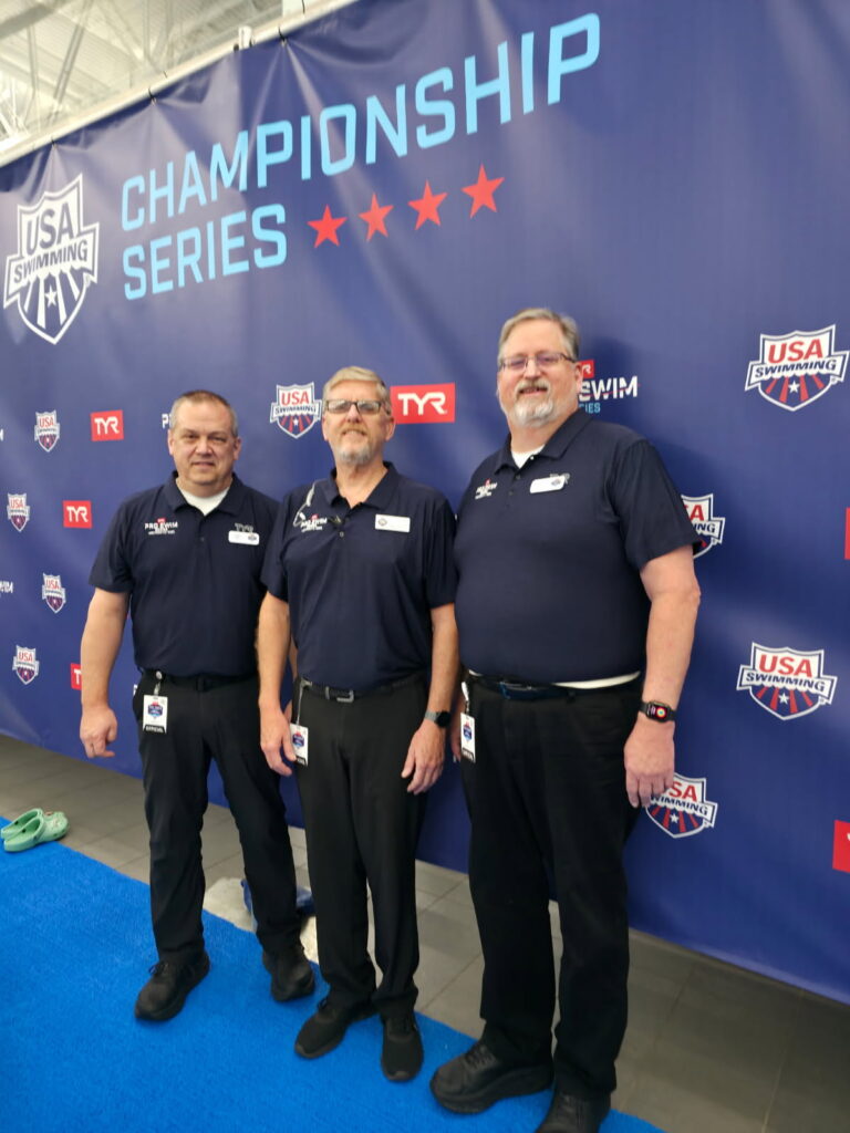 Westmont, IL – NCS Officials who served at the TYR Pro Swim Series- Westmont this past week March 5-9, 2025 from left to right (James Keil, John Jewell, and Jeffery Childs). Thank You for your service with USA Swimming and NC Swimming. #OFFICIALLYAWESOME #WEARENCS